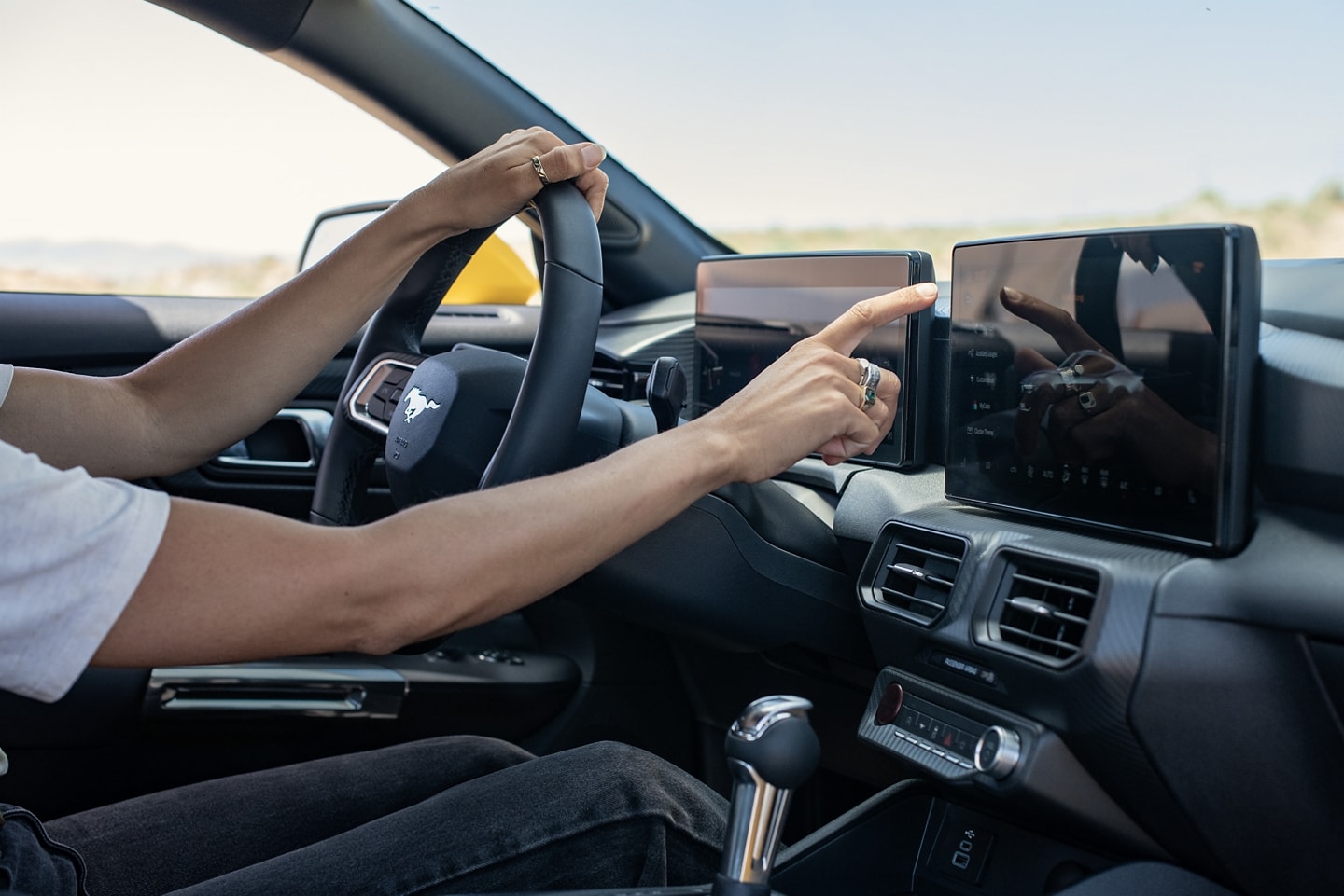 You will surely be impressed by all the Mustang's high-tech features. Standard Track Apps lets you see your performance metrics on the 12.4-inch digital instrument cluster and the 13.2-inch main touchscreen display. You'll also enjoy features like Apple CarPlay®, Android Auto™, an available Bang & Olufsen™ sound system with 12 speakers and a subwoofer, and a wireless charging pad for compatible devices.