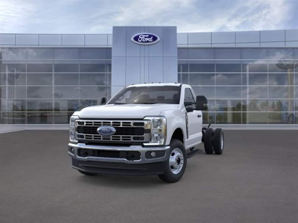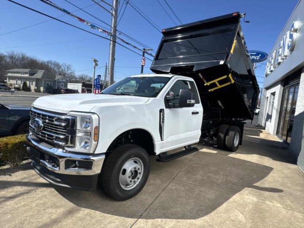 Available now: 2026 Ford F-350 Chassis XL 4WD Reg Cab with only 2 miles! Powered by a robust 7.3L V8 engine (335hp, 468 lb-ft), TorqShift 10-speed automatic transmission, and 4X4 part-time four-wheel drive, this truck is built for serious work. Features include dual rear wheels, snow plow prep package with heavy-duty front springs, Pro Power Onboard 2kW system (with two exterior 120V outlets), trailer brake controller, and the XL Chrome Package (chrome bumper and grille, remote start, halogen fog lamps). Add-on includes an 11 ft x 96" dump body equipped with a 48" steel underbody toolbox on the passenger side, manual tarp and roller system, and pull-out step ladder. Total cost for this upfit is $19,910.00, from Frontline Truck Bodies.
