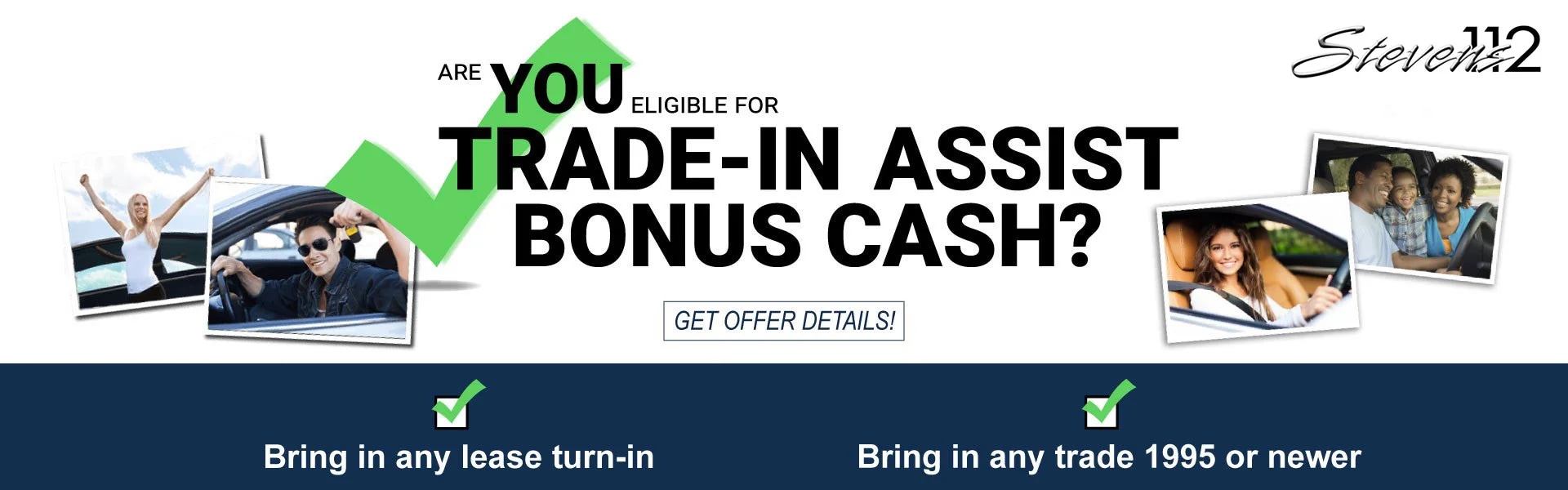 Here at Stevens 112 Ford,Trade Assist Bonus Cash is available to current Ford lessees, competitive lessees, and customers with a trade-in vehicle. The vehicle must be 1995 or newer in order to qualify for our Trade Assist Bonus Cash. Additionally, you must have owned or leased the vehicle for a minimum of 30 days. Trade Assist Bonus Cash can be used towards the purchase or lease of your next Ford vehicle. Below you will find all of our inventory available with the Trade Assist Bonus Cash and the corresponding offer amounts. We would be happy to help you in your car shopping experience feel free to Contact Us if you have any questions.